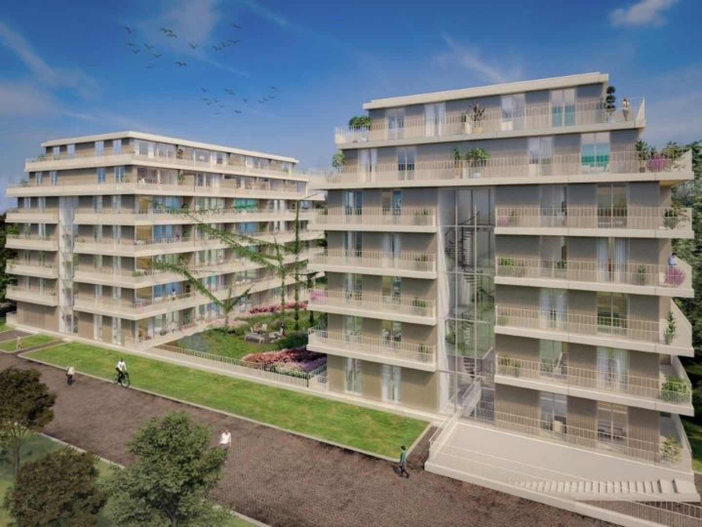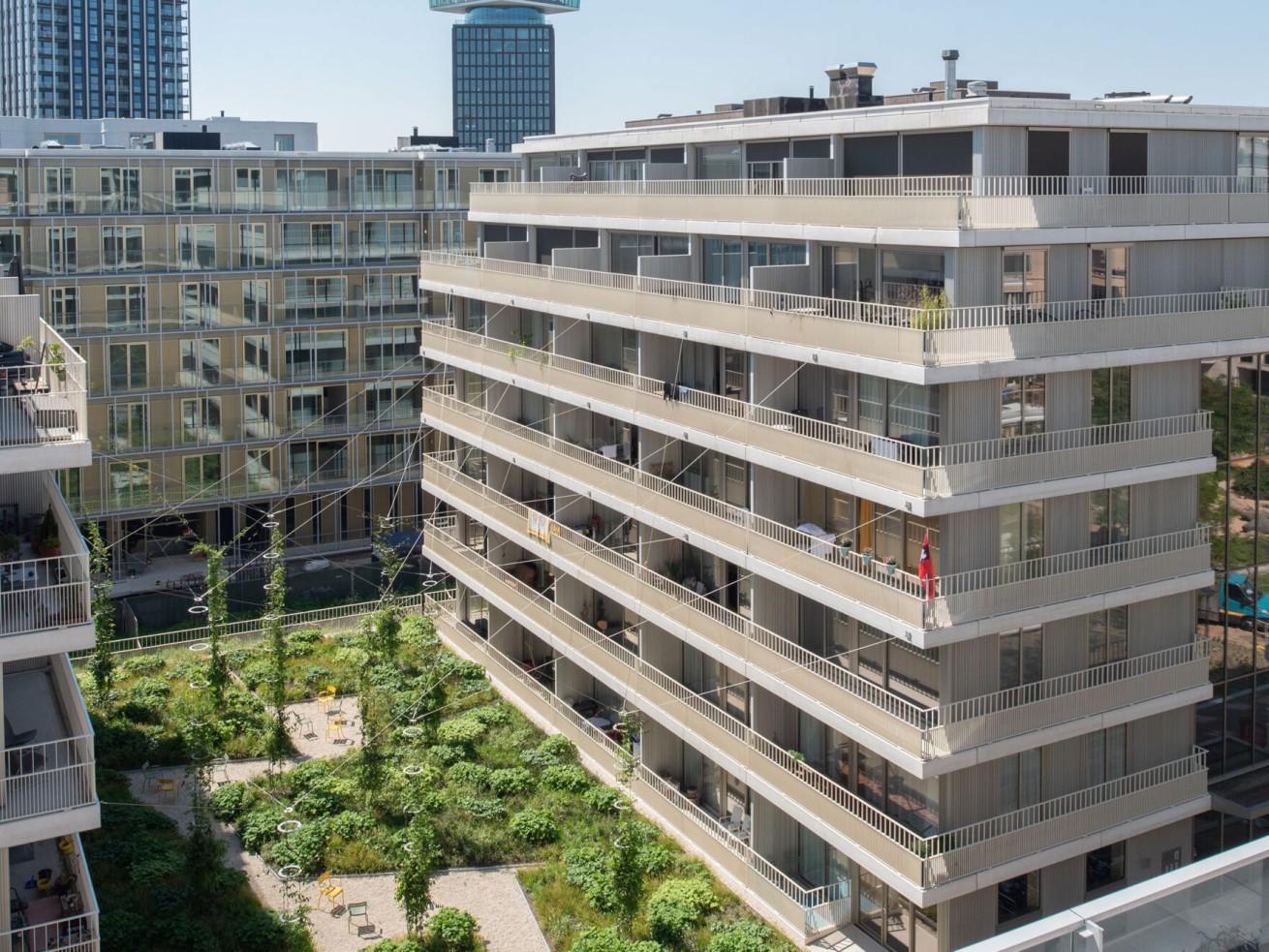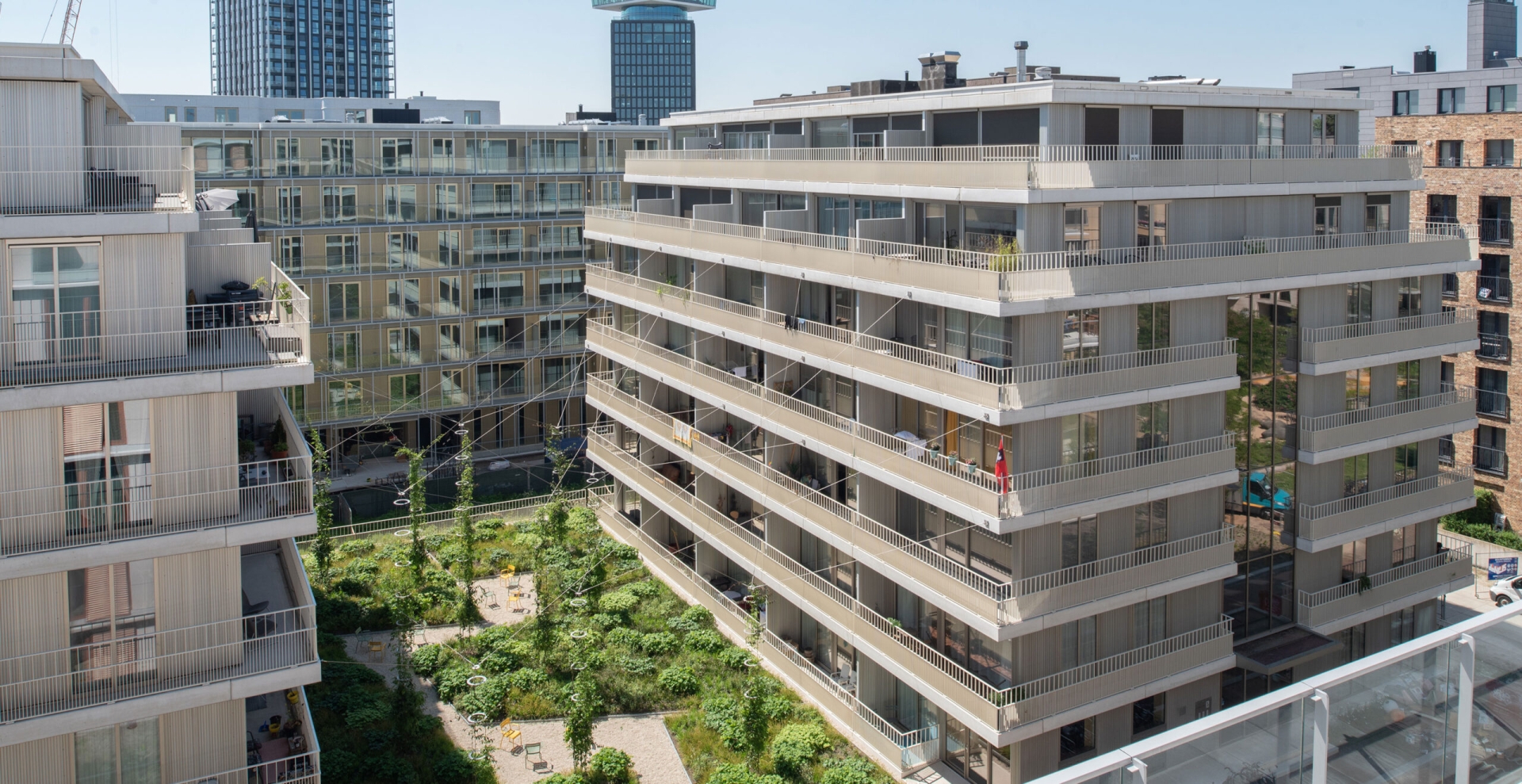 Nabij de Overhoekstoren in Amsterdam Noord zijn twee woontoren gerealiseerd, de blokken B1 en B2. Dit complex bestaat uit twee blokken met daaronder een verbindende parkeergarage. Tussen de gebouwen staat een daktuin. De gebouwen hebben 6 verdiepingen waarbij vanaf de 5e verdieping de vloeren zijn ontworpen als set-back. Het casco is uitgevoerd in beton, waarbij de prefab balkons met isokorf bevestigd zijn aan de verdiepingsvloeren. Vanaf de begane grond konden, door slim te ontwerpen, de vloeren en wanden gestort worden met tunnelbouw methodiek.